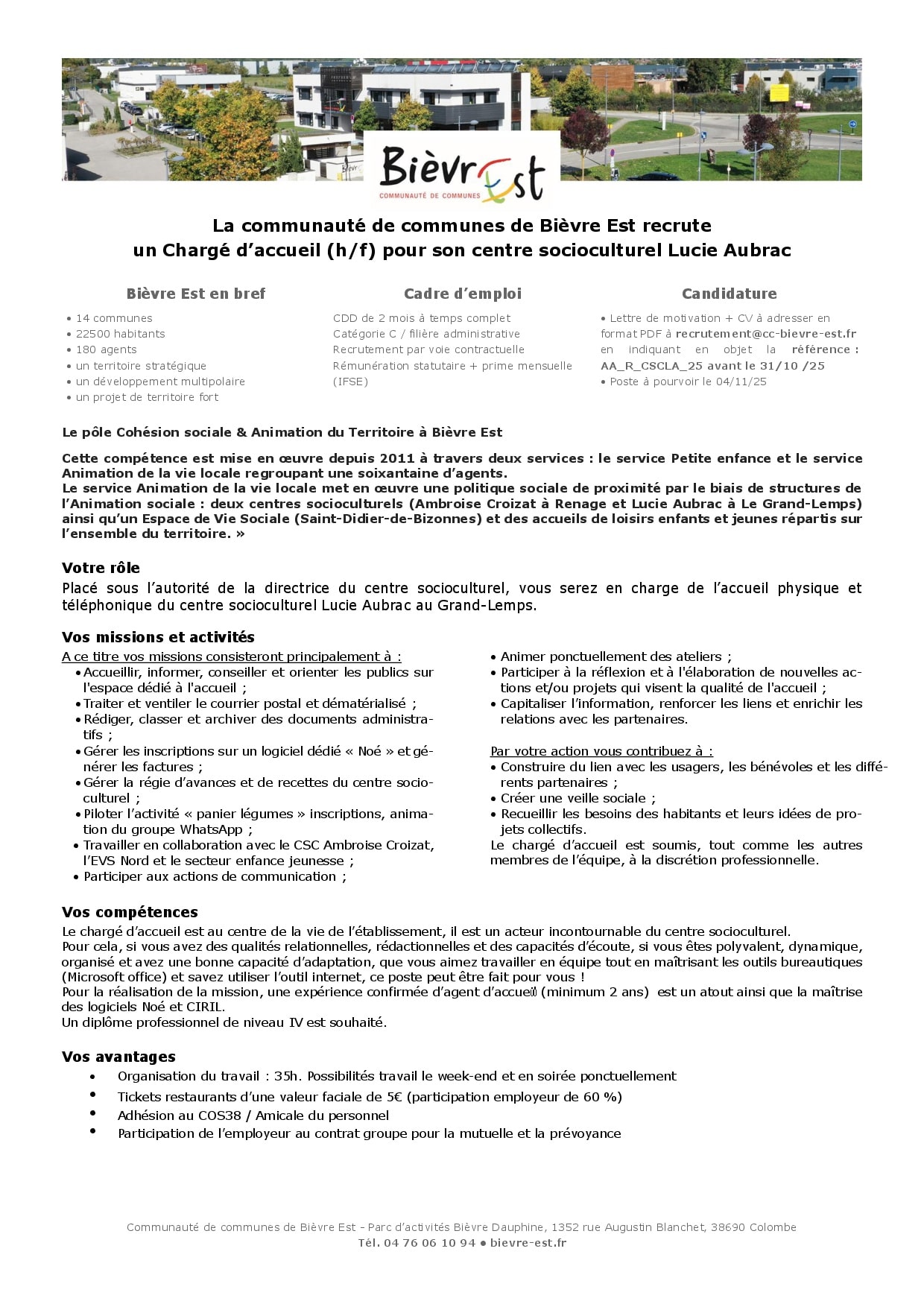 • Poste de Chargé d’accueil pour le centre socioculturel Lucie Aubrac (h/f) en CDD, à pourvoir au sein de la communauté de communes Bièvre Est. réponse souhaitée avant le 31 octobre 2025.